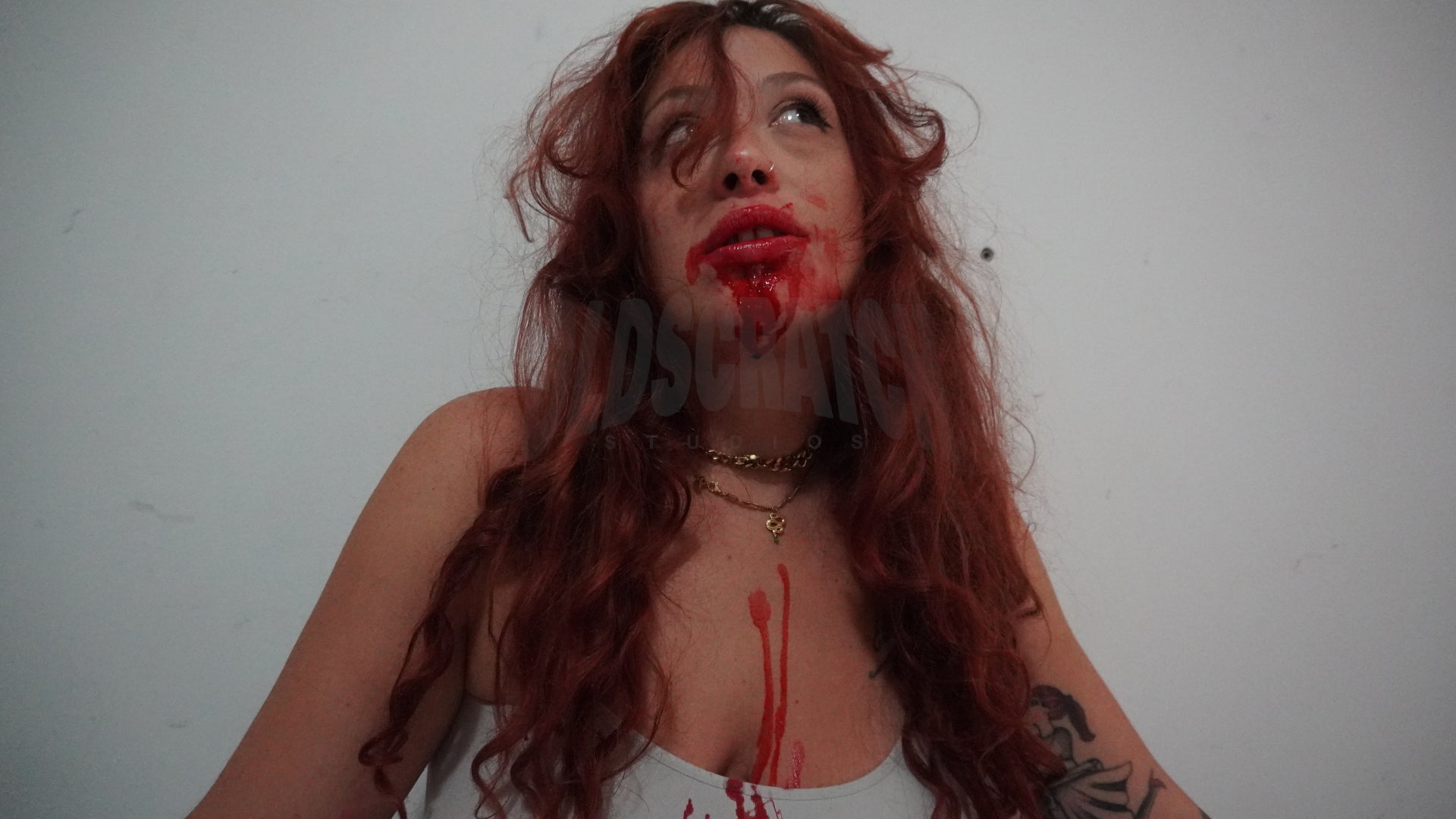 Riccardo scatta una foto ad una Nicole imbrattata di sangue prima di girare l'ultimo capitolo del cortometraggio
